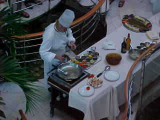 | An Assistant Demonstrats His Skills | Chef Ross Creates Sauteed Sea Scallop And Shrimp On A Garden Vegetable Vinaigrette |